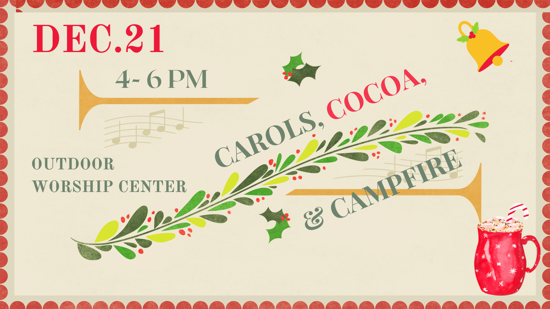 Join us on December 21st at 4 pm for hot chocolate at the Outdoor Worship Center. Bring your ukulele, guitar, harmonicas, kazoos, and cowbells. There will be lots of singing, socializing, and carols.