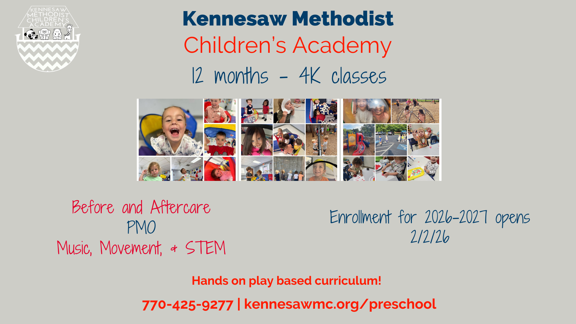 KMCA will soon be enrolling for the 2026-2027 school year. Classes begin Wednesday, August 12, 2026. Tours are available by appointment. Applications are accepted on a rolling basis. Contact KMCA at 770-425-9277 or email preschooldirector@kennesawmc.org for more information.