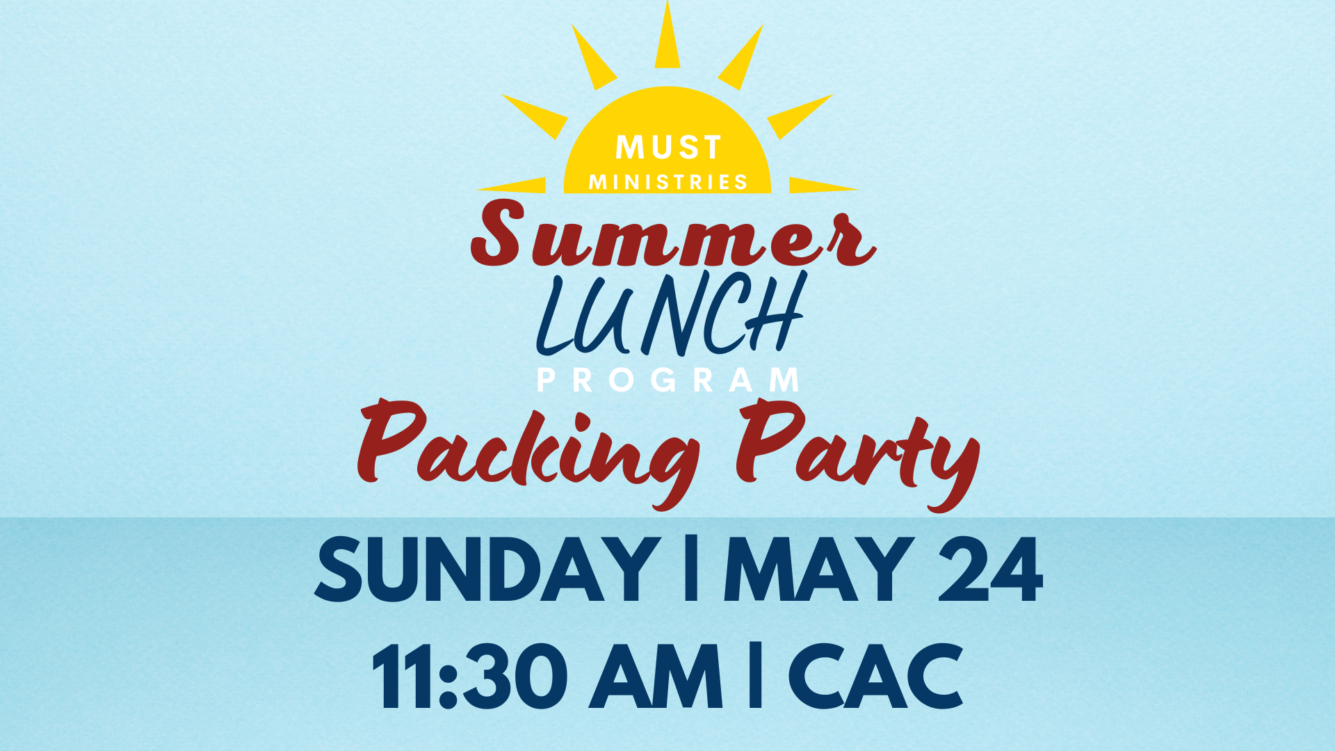 We NEED YOUR HELP to pack our goal of 1,080 lunch bags. On May 24, we will host a packing party in the CAC after our 10:30 am worship service, and we would love for you to be there to aid us in packing the lunch bags. Many hands make light work, so we hope you will consider joining us in this great cause.