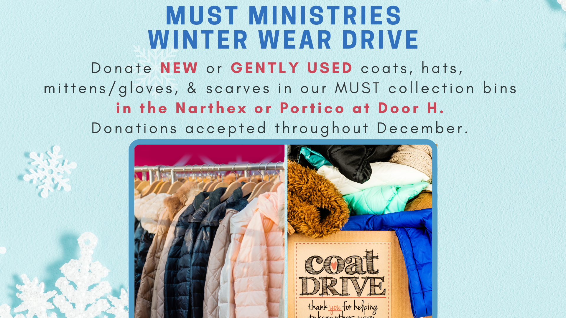 Donate new or gently used coats, hats, mittens, gloves, and scarves in our collection bins located in the Narthex or Portico at Door H. Donations are accepted throughout December.