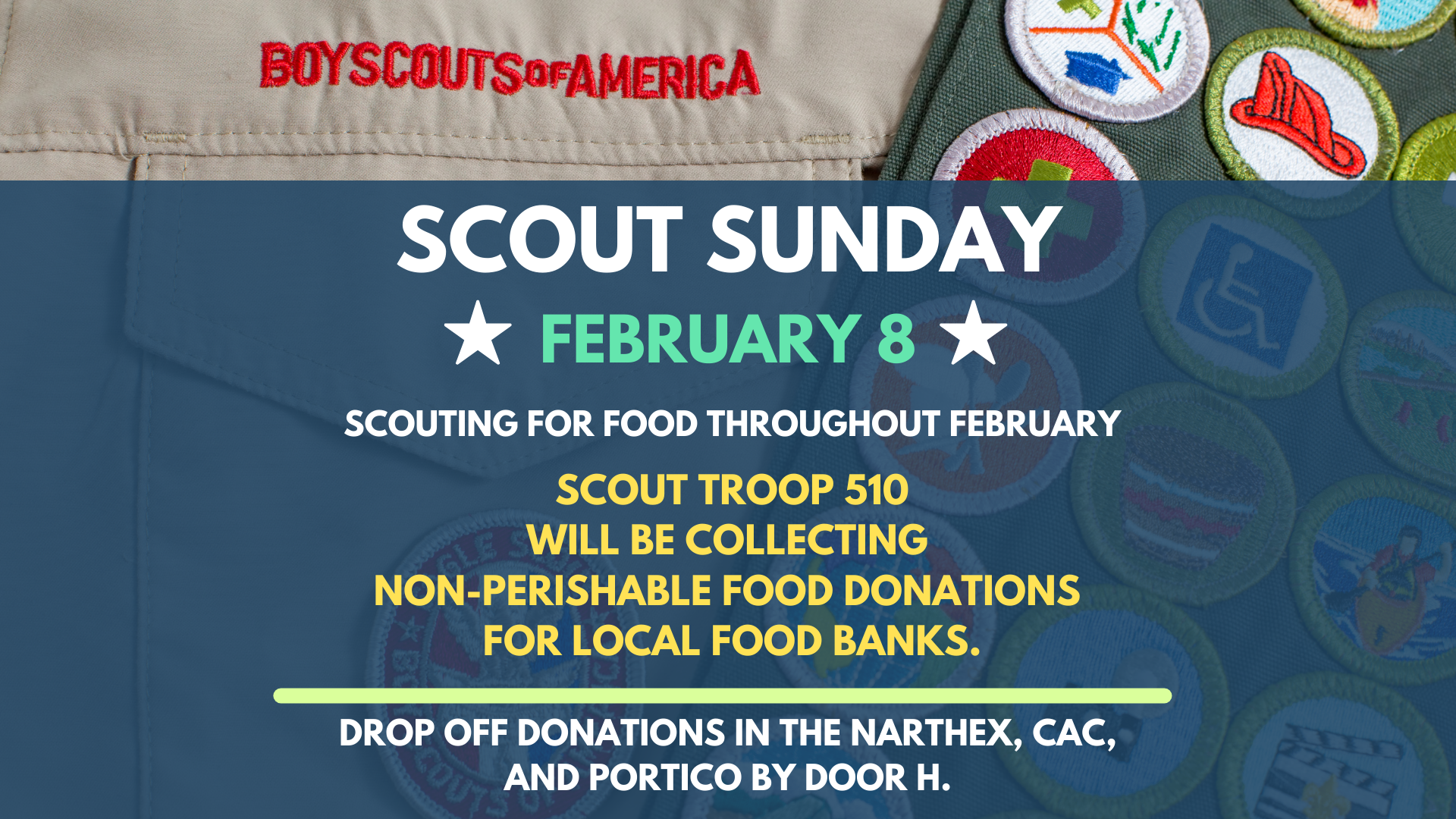 Scout Sunday will be on February 8th. Scout Troop 510 will serve as ushers and greeters during both services. They will distribute bags to collect non-perishable food items to benefit local food banks. Food donations will be collected throughout the entire month of February. You can drop off your donations in the basket in the CAC, the Narthex, or the bin under the portico at Entrance H.