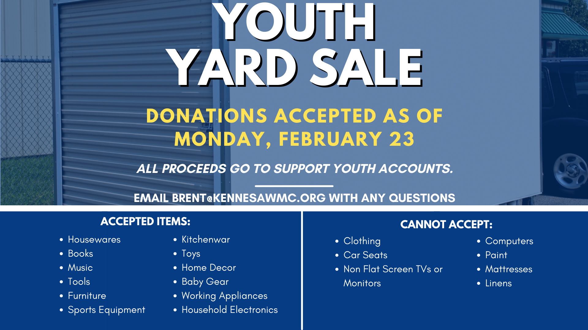 Our Youth will host a church-wide yard sale on Saturday, March 21st from 8 am to 1 pm in the Parking Lot. They will begin accepting donations for the sale on Monday, February 23rd. Accepted items include housewares, books, music, tools, furniture, sports equipment, kitchenware, toys, home decor, tools, baby gear, working appliances, and household electronics. All proceeds will go to support Youth accounts. If you have any questions, please contact Pastor Brent Vicars at brent@kennesawmc.org.